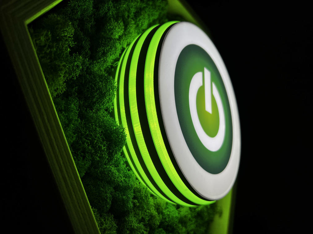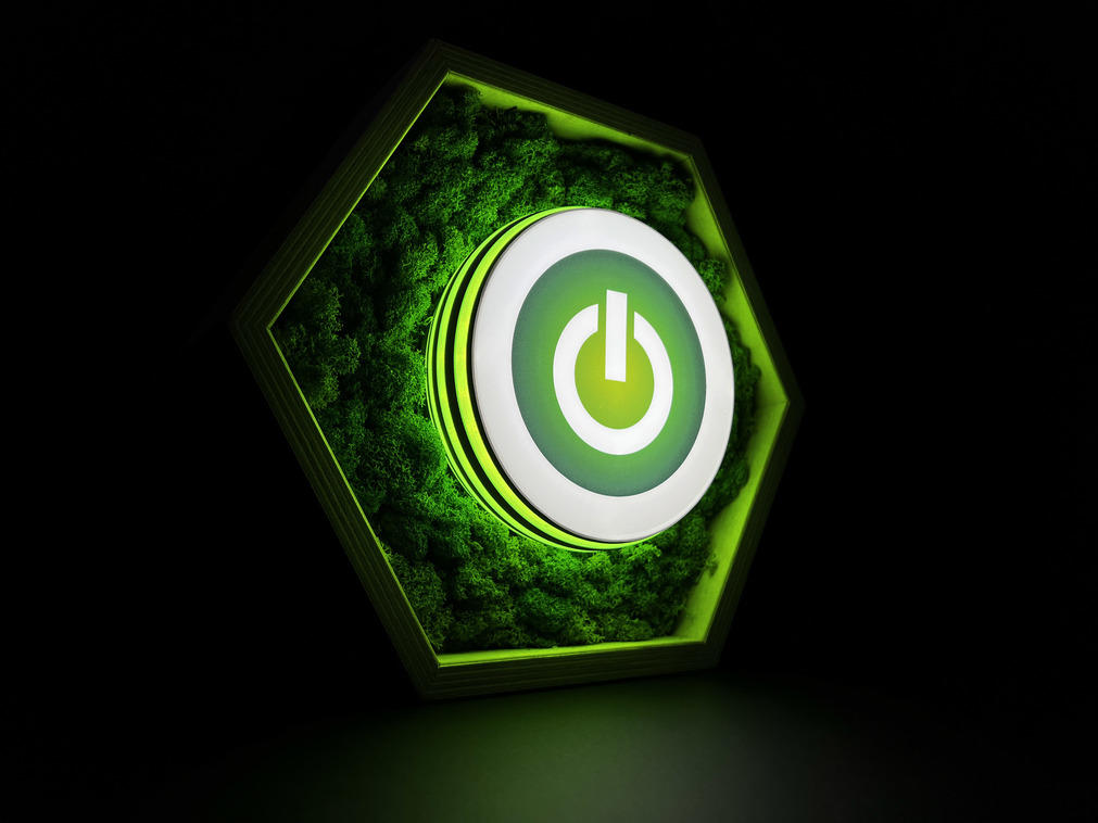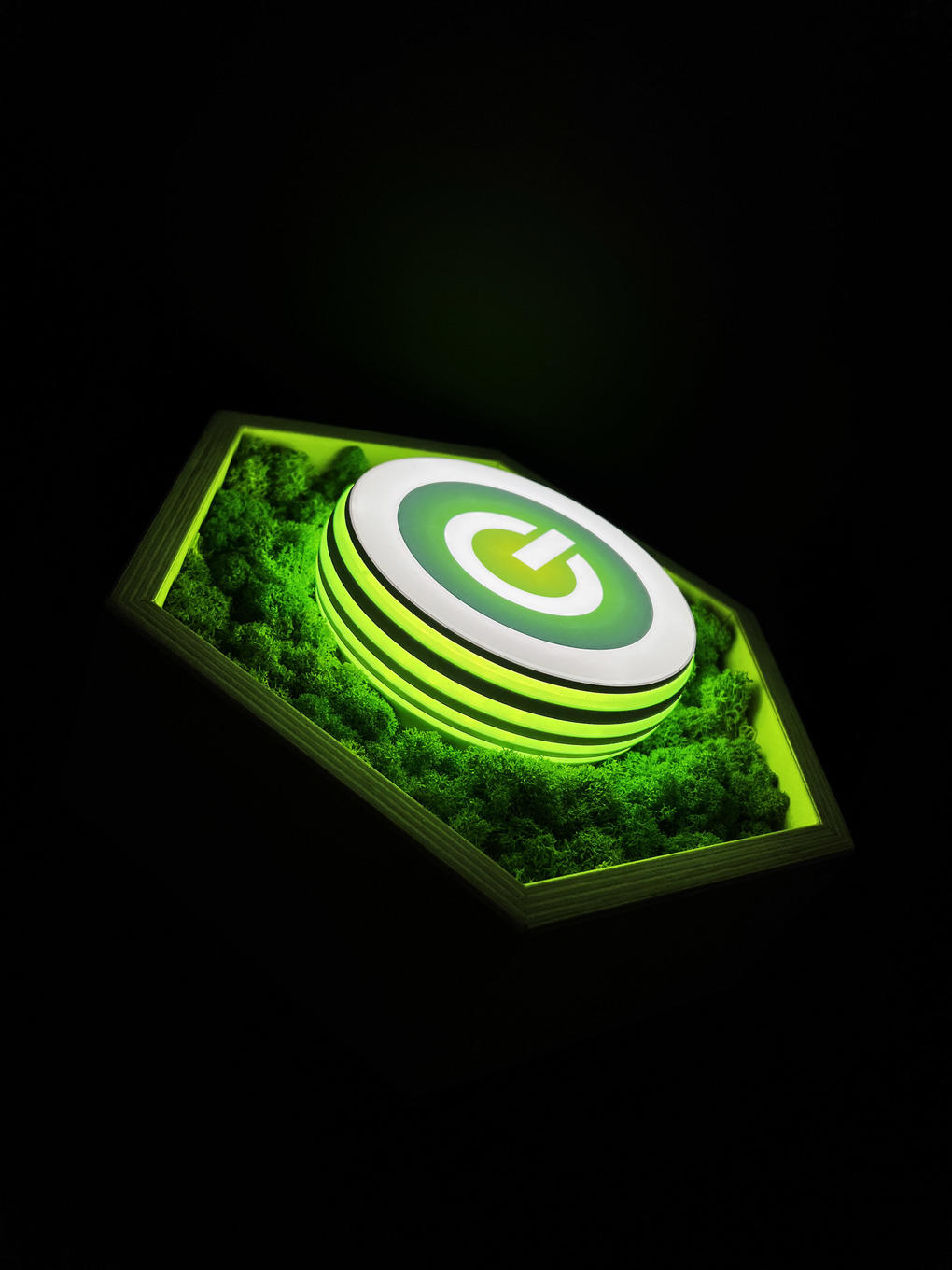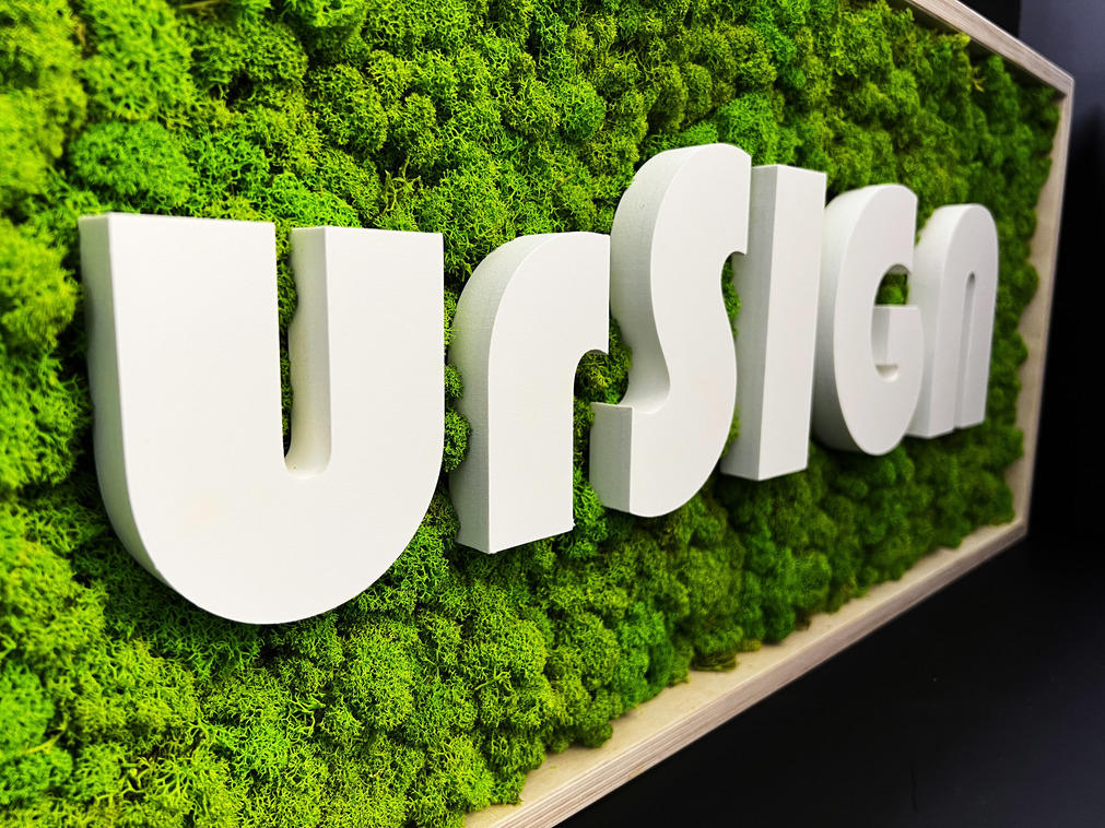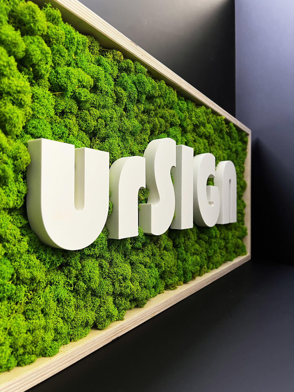 Das schalldämmende Islandmoos läst sich auch gut mit einem Leuchtlogo oder einer Flachschrift kombinieren.